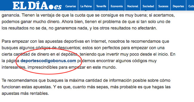 Como seguimos viendo casi cada día, portales online como EuropaPress o eldia.es, se dedican a incluir artículos en los que aparecen palabra clave relacionadas con el juego. A éstas palabras clave se les añaden enlaces que derivan al lector a páginas web de afiliados de juego en las que se promocionan ofertas de estas salas “no reguladas”. Esta clase de promoción se puso de moda hace varios años cuando el intercambio de links era una de las prioridades para el posicionamiento en Google. Ahora, la polítca de enlaces no es tan relevante como en el pasado, pero evidentemente, para una web de juego como las que vemos promocionadas en estos artículos -por ejemplo deportescodigobonus.com- es muy bueno que un medio de comunicación como EuropaPress -que genera docenas de contenidos relevantes cada día- se decida a incluir un enlace directo en alguno de sus artículos a la página. La razón es que Google identifica esos enlaces como algo de gran utilidad para el lector...