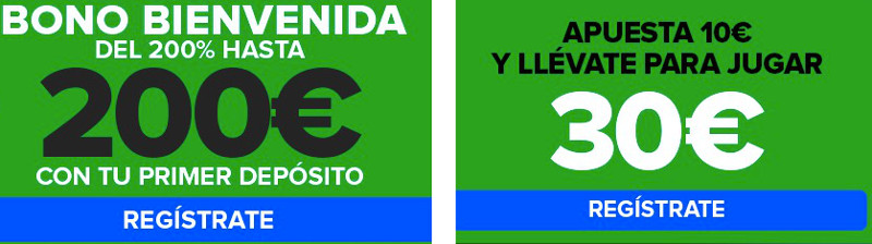 El bono de bienvenida del 200% hasta 200€ que ofrece actualmente Codere a los nuevos clientes es sin duda uno de los más atractivos del mercado. Codere ha optado aquí por una estrategia muy agresiva y que va a llamar la atención a los apostadores más experimentados que realizan primeros depósitos de cantidades altas, a la que además acompaña un ejemplo práctico en forma de reclamo de deposita 10€ y tendrás 30€ para apostar, perfecto para los nuevos clientes que buscan ir conociendo poco a poco la sala y prefieren realizar un depósito pequeño.