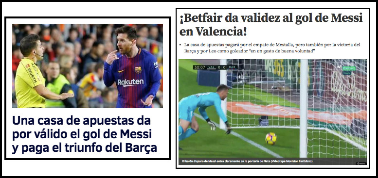 En este caso, tras la claridad de las imágenes en las que se ve cómo el portero del Valencia saca de dentro de la portería el balón, Betfair ha decidido pagar a los usuarios que apostaron por el empate de Mestalla -el resultado oficial que se dió- , pero también por la victoria del Barça y por Leo como goleador “en un gesto de buena voluntad”