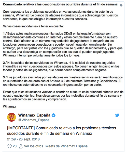 @Winamax_Espana) publicó sendas notas informativas poniendo en conocimiento a sus jugadores lo que estaba ocurriendo. No es habitual, pero en este comunicado, se hablaba claramente de ataques DDoS y no de simples problemas técnicos -que suele ser el aforismo que utilizan los operadores en estos casos).