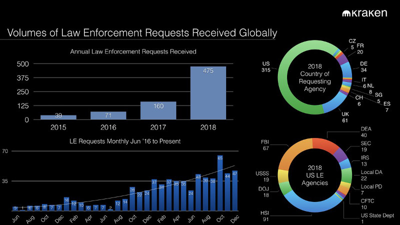 Datos aportados por el exchange Kraken en el que se muestra cómo 2018 ha sido el año donde las Administraciones Públicas han triplicado sus peticiones de información sobre las operaciones de sus clientes.