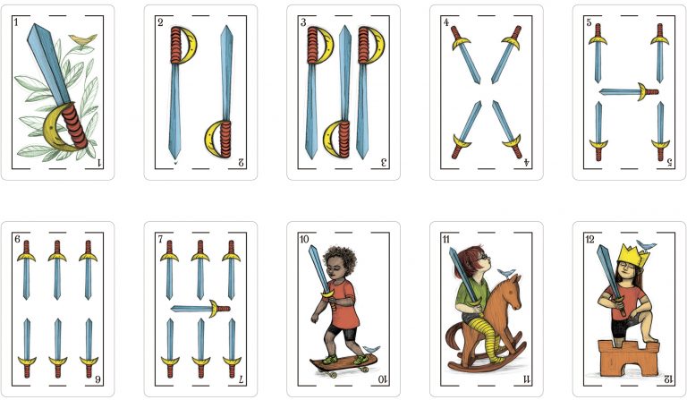 A lo que Noemí añade, «Para mi aportación ilustrada en las espadas, he querido recordar el valor de los juguetes. Rememoré al iniciar el proceso, las espadas de madera hechas con dos palos y una cuerda, las coronas de cartón, los castillos de barro y arena, los tirachinas de rama, los patines hechos con tablas, las figuras de pasta de papel … fabricarse el juguete con materiales más cercanos, y reutilizar con ingenio. Reivindiquemos que el juego sea inventarse el juguete.”