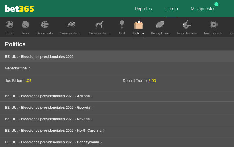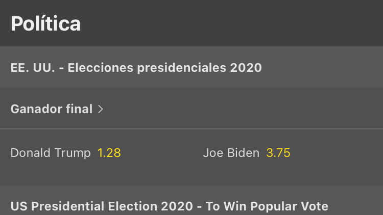 Varios operadores de apuestas deportivas con licencia en España han ofrecido el mercado de apuestas en vivo para las elecciones de Estados Unidos desde el cierre de los primeros colegios electorales en la noche del martes (hora española). Esperando que el mercado permaneciera abierto durante toda la madrugada y como sucediera en 2016, que a primera hora de la mañana se pudiera anunciar el ganador y dar por acabadas las apuestas en directo mientras duraba el escrutinio.