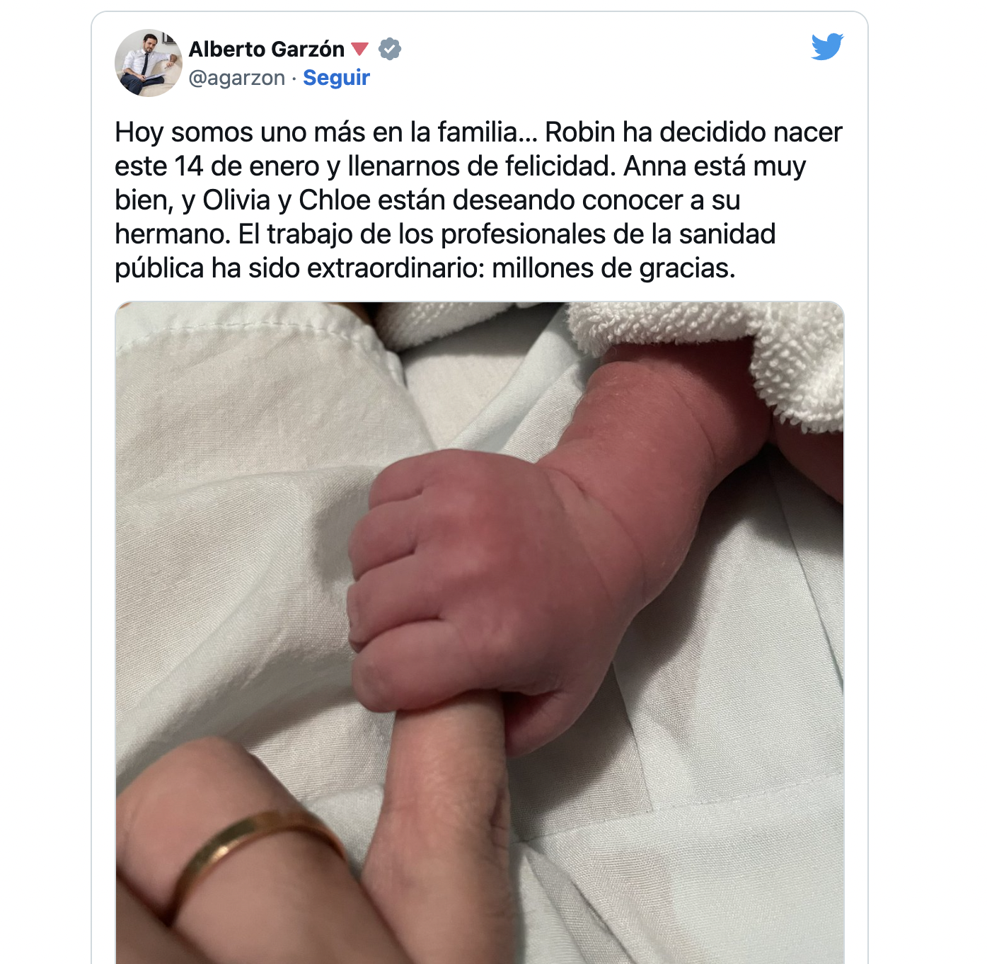 Alberto Garzón, ministro de consumo, está de celebración: ha nacido su tercer hijo, Robin. El coordinador federal de Izquierda Unida ha anunciado la buena noticia en un tuit, en el que aprovecha para lanzar un mensaje a favor de los sanitarios que han atendido a su esposa,