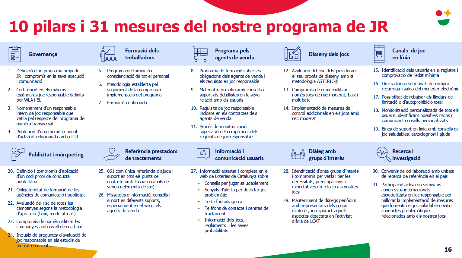 Este enfoque integral se traduce en 31 medidas concretas que abarcan desde la certificación en estándares internacionales hasta la inclusión de requisitos de juego responsable en contratos y campañas.